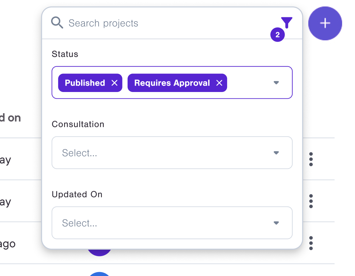 You can combine search terms in the search bar with multiple filters to refine your results further. For example, you can search for “park” in Projects while also filtering by Status: Published to see only published projects with “park” in the title or description.