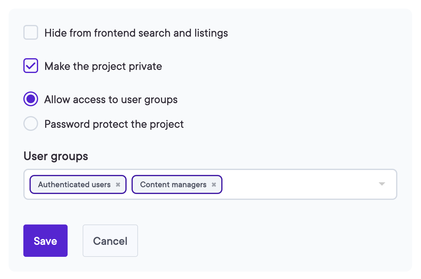 - Allow access to user groups: Select specific user groups like Authenticated users or Content managers who can access the project.