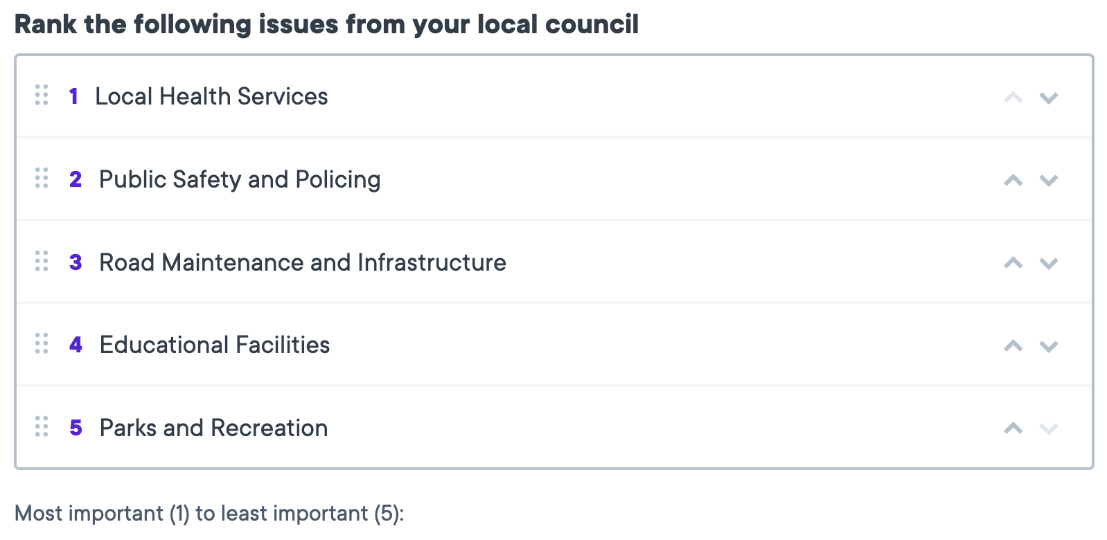Rating scale questions ask respondents to rate a statement or an item on a scale. These questions are useful for measuring opinions, attitudes and behaviours, and can provide more detailed data than a multiple choice question. Similarly, a Ranking tool asks respondents to order a list of options by preference.
